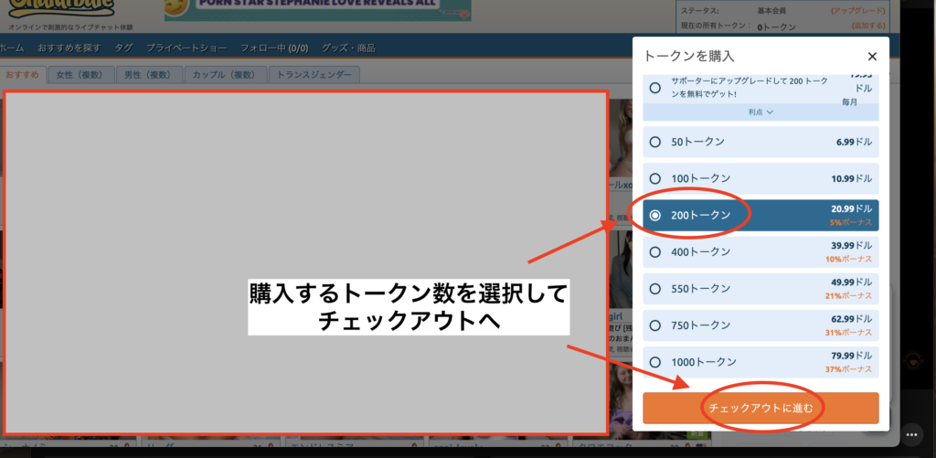 プレミアム会員(月額19.95ドル)には、初回限定のトークン特典があります。登録時に、200トークン(約21ドル相当)が付与されます。